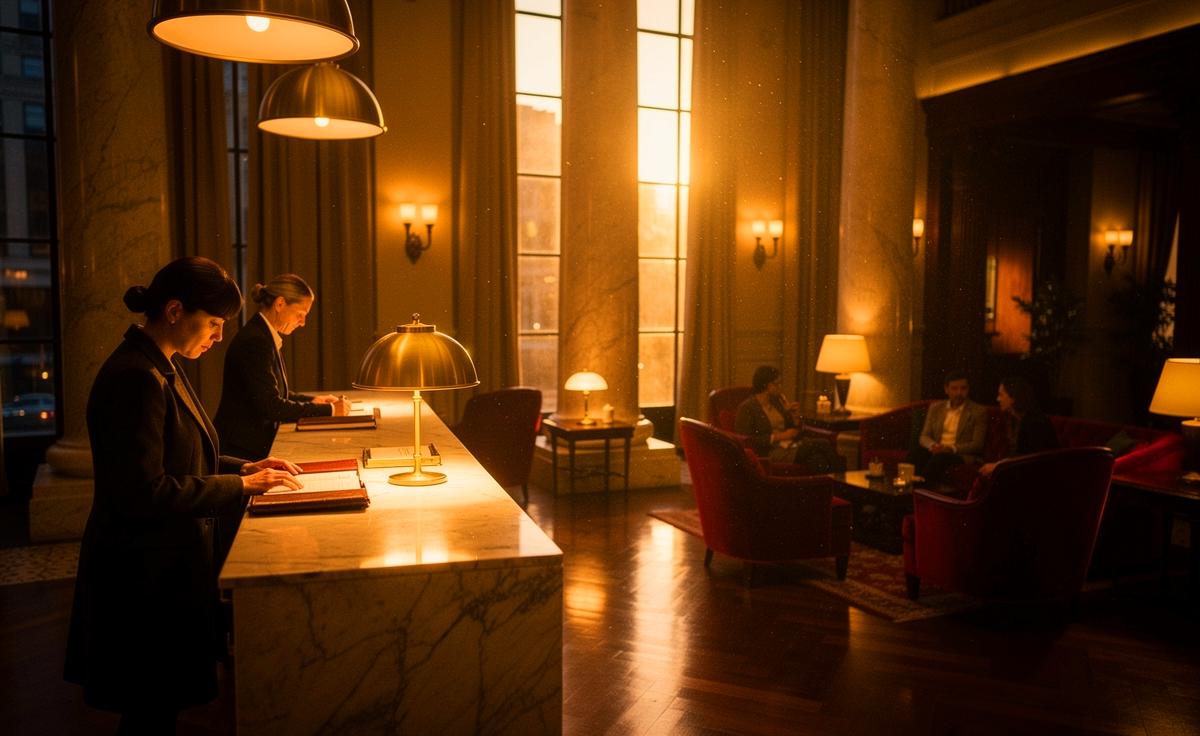 | Gedämpfte Rezeptionsgespräche | Diskrete Absprachen, Gästepräferenzen, Logistik | Hotelpersonal, aufmerksame Gäste |