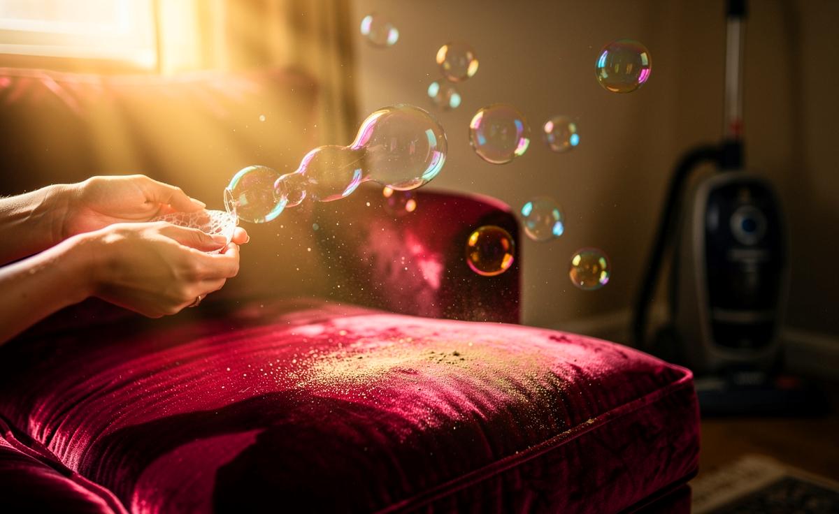 Die Technik basiert auf einem simplen physikalischen Effekt. Die dünne Seifenblasen-Haut, ein Film aus Tensiden und Wasser, wirkt wie ein magnetisches Netz. Beim Kontakt mit einer staubigen Oberfläche – sei es ein Polster, ein Teppich oder eine Fensterbank – lagern sich feinste Partikel an der feuchten Außenhaut an und werden in die Blasenwand eingeschlossen. Mikrofasern, Hautschuppen und sogar Pollen werden so gebunden. Der entscheidende Vorteil gegenüber dem Saugen: Es gibt keinen Luftstrom, der den Feinstaub lediglich aufwirbelt und in der Raumluft verteilt. Stattdessen erfolgt eine direkte, lokale Bindung. Die mit Schmutz beladenen Blasen platzen nach kurzer Zeit von selbst und hinterlassen einen minimalen, feuchten Film, der sofort mit einem Mikrofasertuch aufgenommen wird und dabei den gebundenen Schmutz restlos entfernt. Dieser Prozess ist besonders schonend für empfindliche Materialien und Möbeloberflächen.